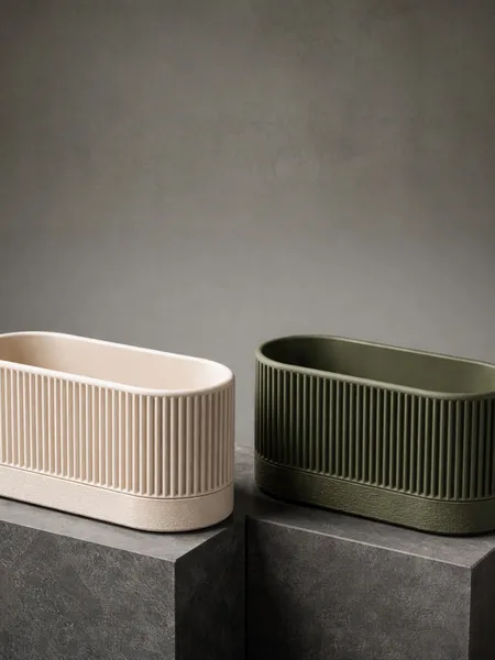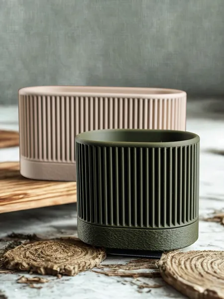 um conjunto de dois vasos minimalistas modernos, onde linhas limpas encontram texturas • vaso maior ~ x • 180 · y • 80 · z • 72 • vaso menor ~ x • 110 · y • 80 · z • 72